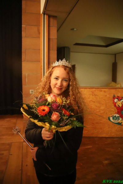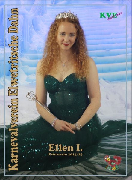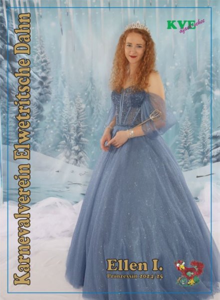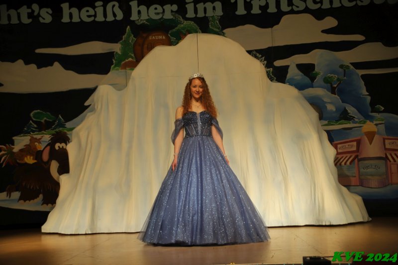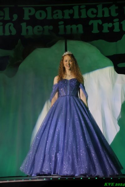 Aus einem riesigen Eisberg heraus trat die Nachfolgerin ihr Amt an. Wer das sein würde, ist beim KVE das bestgehütete Geheimnis. Selbst die allermeisten Mitglieder hatten keine Ahnung, wer die neue Tollität sein würde. Um 22:53 Uhr sollte das Geheimnis gelüftet sein. Ellen Pawlitschko als Ellen I. trat zum Vorschein als KVE-Eisprinzessin der Kampagne 24/25.